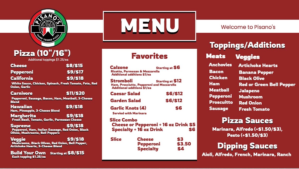 Welcome to Pisano’s Pizzeria, a culinary gem nestled in Biloxi, MS, at 1036 W Howard Ave. Known for its commitment to freshness, each dish promises a delightful experience. The menu is a celebration of authentic flavors, with standout items like their acclaimed calzones and California pizza, praised for a perfectly balanced thin crust—crispy yet soft.